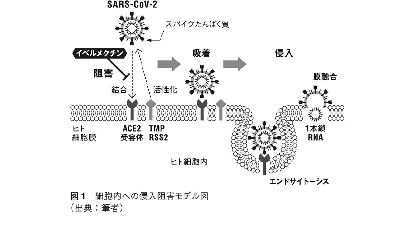 イベルメクチンはこのスパイクたんぱく質との結合を阻害することでウイルスのヒト細胞への吸着・侵入を阻害していると推定されています(42)。