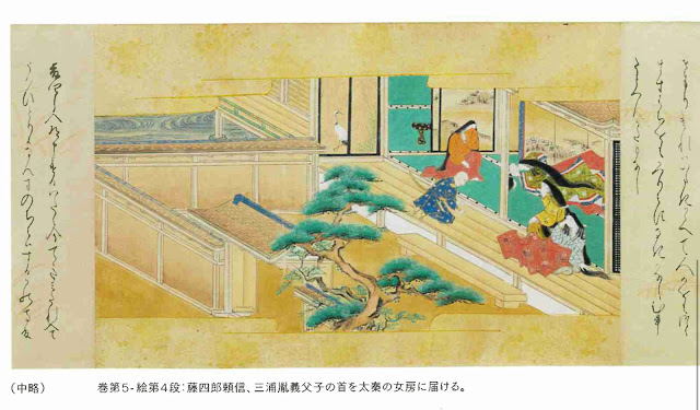 三浦判官胤義の子供、十一、九、七、五、三歳になる五人がいた。矢部の祖母の許で養い置いていたのを権大夫義時が、小河十郎を使いに建てて、皆を召し出した。尼の力も及ばなかった。